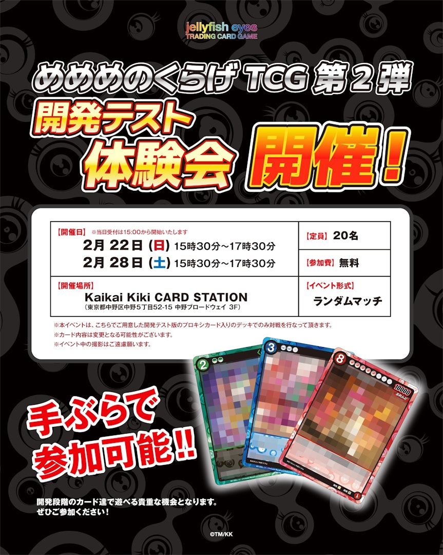 この度、その開発プロセスの一部をプレイヤーの皆様に体験していただくべく、「めめめのくらげTCG第2弾 開発テスト体験会」の実施が決定いたしました。